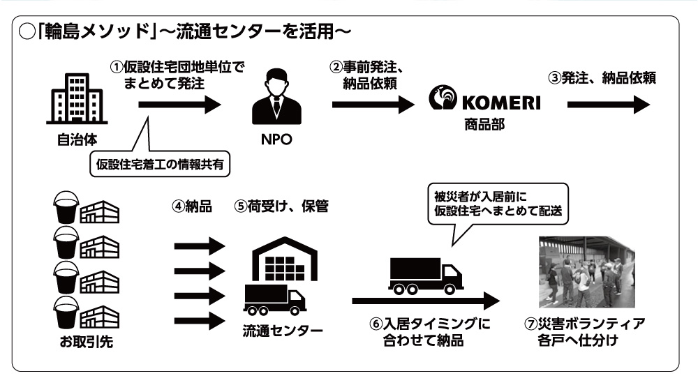 自治体の要望に応じて仮設住宅の世帯数ごとに物流センターで商品をまとめて、仮設住宅ごとに仕分け、配送を実施