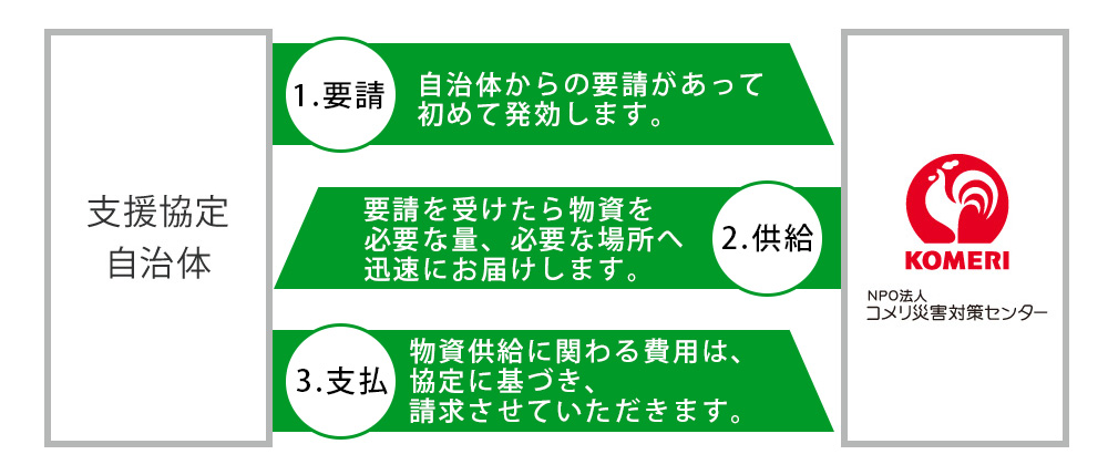 当法人は、株式会社コメリの関連企業を含めたお取引先様と出店地域の各自治体様との物資供給ネットワークを構築し、災害発生時に備えるものです。
